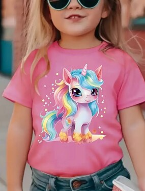 Chica 3D Graphic Unicornio Camiseta Manga Corta Verano Primavera Moda Básico Niños 4-12 años Cuello Barco Exterior Casual Diario Ajuste regular