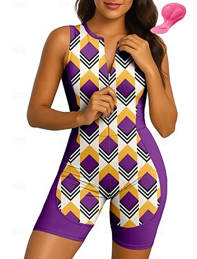 Mujer Traje de triatlón Conjunto de camiseta de ciclismo Sin Mangas Verano Amarillo Morado Geométrico Bicicleta Almohadilla 3D Secado rápido Resistente a los UV Cremallera delantera Bandas