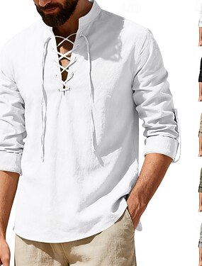 Hombre Camisa Camisa de lino Estilo vikingo Camisa de verano Ropa de playa Camisa con cuello mao Color sólido Casual Vacaciones Negro Blanco Verde Trébol Caqui Manga Larga Cuello Camisero Verano
