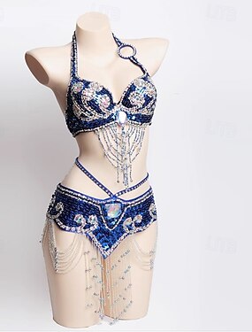 Ropa de baile samba Conjunto de danza del vientre Cadena de cuentas de gema azul profunda con flecos Vestuario de actuación