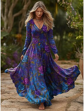 Vestido Maxi Boho de Mujer Vestido Plisado Fiesta Casual Diario Cita Salir Ajuste Regular Floral Gráfico Manga Larga V Cuello Azul Fucsia Primavera Otoño Invierno