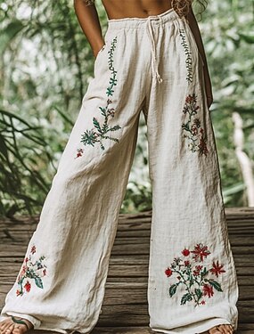 Mujer Perneras anchas Pantalones Pantalones palazzo Casual Boho Longitud total Alta cintura Flor Correa Cintura elástica Estampado Transpirabilidad Cómodo Calle Ropa Cotidiana Noche Blanco Frío