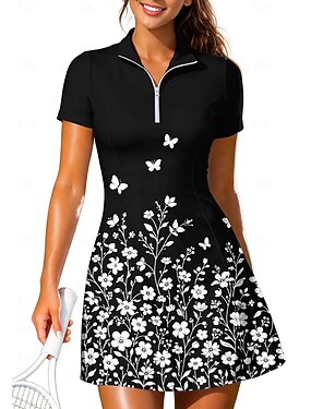 Mujer Flores Vestido de tenis Manga Corta Estampado Transpirable Tenis Golf Bádminton Cuello Cuello de polo Vestidos Negro con Blanco Ropa de tenis