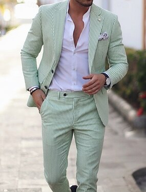 Trajes de Seersucker para Boda Casual en la Playa para Hombre de Rayas con Solapa Notch Rosa y Azul Cielo Moda Ligera Ajuste Personalizado de 2 Piezas de Un Solo Botón