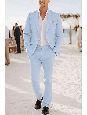 De los hombres Trajes de Lino boda en la playa Blanco Azul cielo Primavera verano Traje Solapa de Pico Casual Formal Color sólido Ajustado Juego de 2 piezas Recto 2 botones