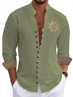 Hombre Sol Étnico Cultura india Camisa Camisa de cuello alto Manga Larga retro de la vendimia Vacaciones Ropa Cotidiana Noche Primavera Otoño Collar mandarín Cuello alto Abotonar Camisa tipo lino