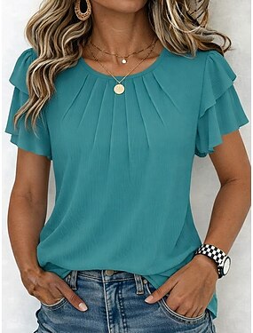 Mujer Camiseta Camiseta superior Frunce Plano Elegante Moda Clásico Manga Corta Cuello Barco Tops regulares Diario Noche Fin de semana Negro Blanco Azul Marino Verde Trébol Albaricoque Verano