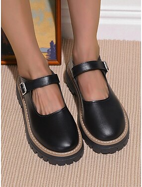 Zapatos Mary Jane negros gruesos con hebilla para mujer: plataforma de piel sintética para adolescentes y mujeres, ideales para la escuela, ropa de calle y conjuntos de otoño.