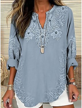 Blusa de mujer de lino como transpirable ligera gráfica floral elegante bohemia vintage manga larga cuello en V tops regulares diario vacaciones ropa de playa arrugada bordada impresión rosa azul