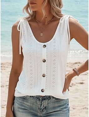 Mujer Camiseta sin mangas Tops elegantes Camiseta superior Ojal Color sólido Hawaiano Casual Estilo playero Sin Mangas Cuello Barco Tops regulares Diario Ropa de playa Ropa de vacaciones Negro Blanco