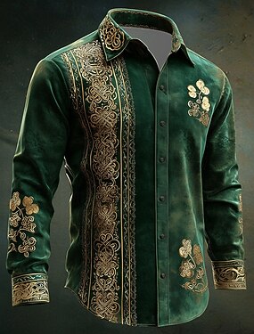 Camisa de arte celta de trébol de cuatro hojas de San Patricio para hombres camisa de botón de manga larga vintage retro vacaciones primavera otoño con cuello camiseta de impresión 3D tipo lino verde