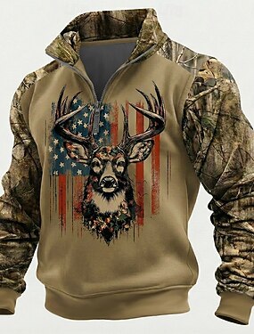 Hombre camuflaje Color Camuflaje Venados Sudadera Táctico retro de la vendimia Caza Escote Chino Exterior Trabajo Regalo Marrón Cremallera Otoño Invierno Diseñador S M L XL XXL XXXL