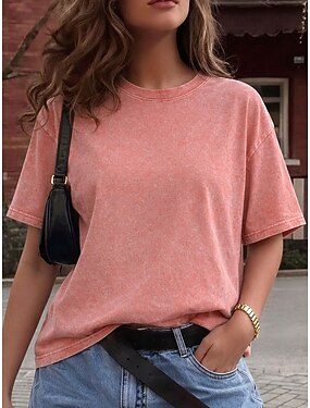 Camiseta de mujer 100% algodón, estilo vintage, con efecto desgastado, manga corta, cuello redondo, manga larga, estilo casual, ideal para el día a día en la playa. Colores: rosa, rojo, azul, verde hierba, negro, naranja, verano y primavera.