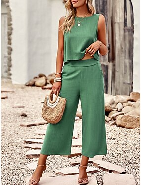 Mujer Conjuntos de pantalones parte superior del bolero Sin Mangas Cuello Barco Color sólido Moda Ropa de calle Casual Diario Exterior Negro Verde Trébol Beige Verano Ajuste regular