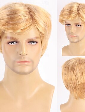 Pelucas sintéticas Rizo suelto Liso Natural Bob corto Corte a capas Con flequillo Hecho a Máquina Peluca 10 pulgadas Dorado claro Pelo sintético Hombre Clásico Cómodo Exquisito Rubio