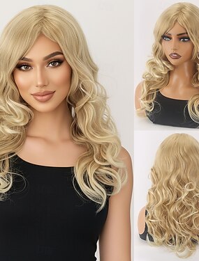 Pelucas sintéticas Ondulado Con flequillo Hecho a Máquina Peluca Larga Negro y Oro Pelo sintético Mujer Rubio
