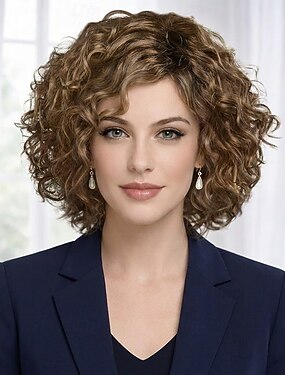 Peluca rizada elegante para mujer: rizos castaños vivos con volumen natural.