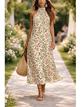 Mujer Vestido Midi Vestido informal Vestidos Boho Chic Bohemia Vacaciones Tropical Playa Festivos Cita Ajuste regular Graphic Tropical Sin Mangas Cuello halter Rosa Verano Primavera