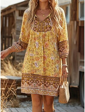 Mujer Vestido Midi Vestido informal Vestido Estampado Vintage africano Diario Playa Fin de semana Ajuste regular Floral Bloque de color Manga 3/4 Cuello Barco Amarillo Rosa Rojo Primavera Otoño