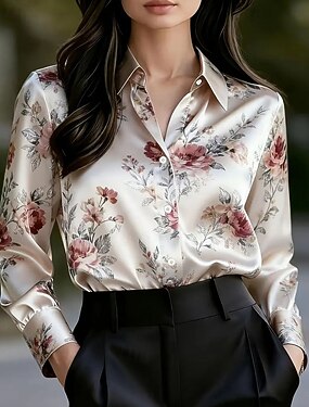 Mujer Camisa Elegant Top de satén Blusa Frunce Botones En Cortina Floral Graphic Plano Elegante Bohemia Vintage Manga Larga Cuello de polo Tops regulares Diario Trabajo Festivos Blanco Verano