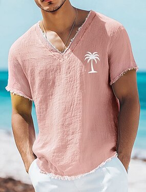 Camiseta de hombre con cuello en V, mezcla de lino y algodón con estampado de palmeras, borde sin rematar, color rosa empolvado, ideal para vacaciones de verano en la playa. Diseño suave y