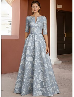 Corte A Hasta el Suelo Vestido de Madrina Media Manga Escote en Pico reina Ana Elegante Vintage Formal Gasa Satén con Flores 3D Bordados Flor