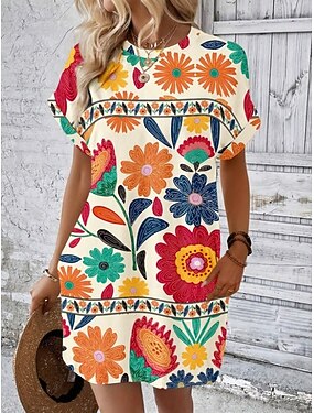 Mujer Mini vestido Vestido de verano Vestido estilo camiseta Casual Playa Noche Vestido de verano Ajuste regular Floral Graphic Media Manga Cuello Barco Naranja Verano