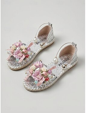 Sandalias planas blancas para mujer con adornos florales, sandalias de playa con punta abierta y detalles de perlas para cenas de vacaciones o fiestas en la playa. &tardes de verano