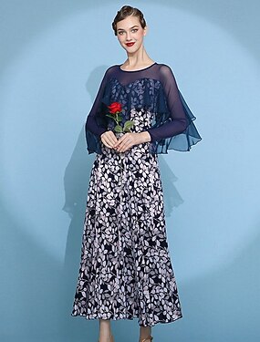 Vestido de baile de salón floral para mujer, con capa de malla superpuesta, vestido de vals, moderno, estándar, traje de baile social de tango, azul marino