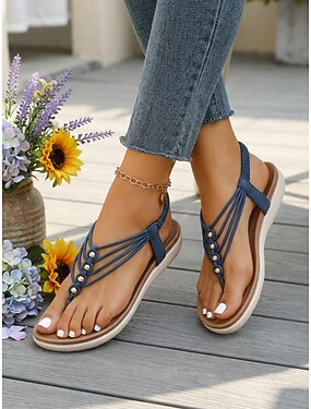 Sandalias de tira con cuentas bohemias para mujer: sandalias planas de estilo bohemio con tira en T y tira elástica en la parte posterior para vacaciones en la playa. & verano