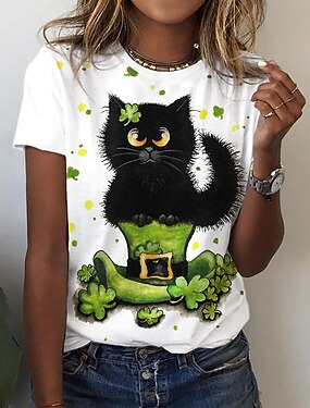Día de San Patricio Mujer Camiseta Estampado Gato 3D Día de San Patricio Día de San Patricio Manga Corta Escote Redondo Tops regulares Diario Fin de semana Verde Trébol