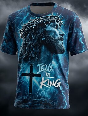 Camiseta de Pascua para hombre con estampado integral de Jesús como Rey, corona de espinas, cruz, rayo, azul eléctrico, poderosa, cristiana, religiosa, manga corta, cuello redondo, regalo de iglesia,