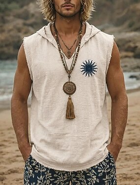 Sudadera sin mangas estilo boho vintage tribal con estampado de sol celestial para hombre, chaleco con capucha, bajo deshilachado, corte holgado, cuello en V, ideal para la playa, vacaciones y