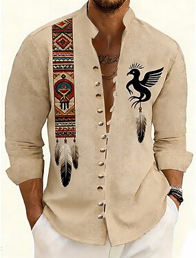 Hombre Étnico Pájaro de trueno Pluma de los nativos americanos Camisa Camisa de cuello alto Manga Larga retro de la vendimia Casual Vacaciones Primavera Otoño Collar mandarín Cuello alto Impresión 3D