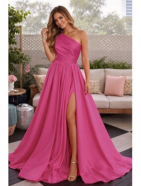 Corte A Hasta el Suelo Trajes de gala Vestidos de noche Corte Cenicienta Vestimenta formal Elegante Minimalista Sin Mangas Un Hombro Fiesta de baile Invitado a la boda Satén con Plisado Abertura