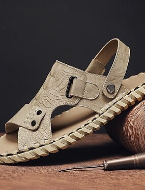 Sandalias de piel sintética con tiras ajustables en color caqui claro para hombre, zapatos cómodos de punta abierta para playa de verano y salidas informales.