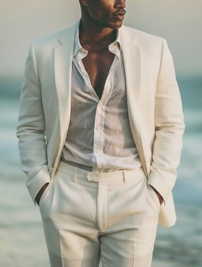 De los hombres Trajes de Lino boda en la playa Negocio Blanco Beige Verano Traje Solapa de Pico Moda Formal Color sólido A Medida Juego de 2 piezas Recto 1 botón