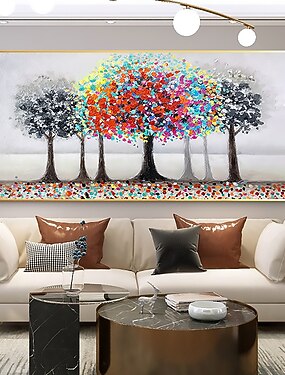Pintura al óleo de árbol colorido original hecha a mano sobre lienzo, paisaje de árbol abstracto, arte de pared para decoración del hogar con marco estirado sin marco interior.