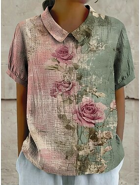 Blusa de mujer con botones, estampado floral, estilo bohemio, para vacaciones, uso diario, manga corta, tejido texturizado, cuello camisero, tops regulares, para uso diario, vacaciones, salidas,