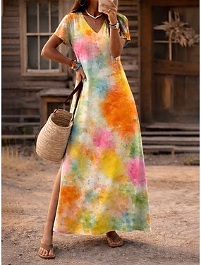 Mujer Vestido maxi Vestido de una línea Casual Diario Playa Ajuste regular Floral Graphic Geométrico Manga Corta Escote en Pico Amarillo Claro Champaña Rojo Arco Iris Verano Primavera