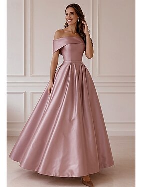 Corte A Hasta el Suelo Vestidos de noche Corte Cenicienta Vestimenta formal Elegante Manga Corta Hombros Caídos Formal Bolsillo Satén con Fruncido