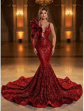 Corte Trompeta Sirena Cola barrida Trajes de gala Vestidos de noche Corte Cenicienta Vestimenta formal Elegante Brillos Y Estrellas Manga Larga Un Hombro Pedida Noche formal Lentejuelas con Lentejuela