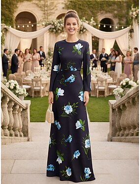 Corte A Hasta el Suelo Vestido Invitada Boda Vestido formal Vestido de noche Vestido de Madrina Manga Larga Cuello Barco Elegante Formal Satén con Estampado flor