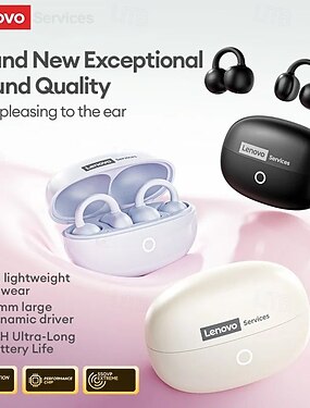 Auriculares inalámbricos Lenovo de clip para oreja abierta, Bluetooth 6.0 con estuche de carga, 30 horas de reproducción, compactos. &Sonido potente, micrófono incorporado, auriculares cómodos para