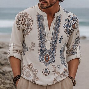 Hombre Camiseta superior Camiseta de lino Manga Larga Escote en Pico Verano Primavera Primavera verano Color sólido Plano Diario Casual Estilo callejero Puro Exterior Calle Casual Bleu Ciel Azul