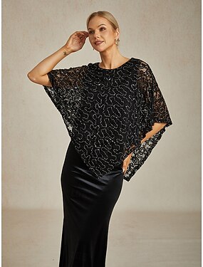 Mujer Poncho Tops elegantes Tops de encaje Tops de noche Lentejuelas Encaje Color sólido Elegante Sin Mangas Cuello Barco Tops regulares Fiesta de Noche Invitado a la boda Ropa de fiesta de noche