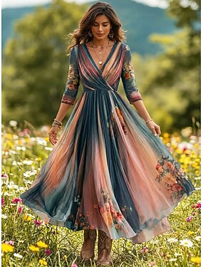 Corte A Hasta el Suelo Vestido maxi Vestido Invitada Boda Vestido de Madrina Manga 3/4 Escote en Pico Elegante Vintage Formal Satén Encaje Organdí con Estampado flor Bordados Flor