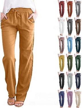 Mujer Lino de algodón sintético Perneras anchas Chinos Pantalones de verano Vacaciones Ropa de calle Básico Longitud total Media cintura Plano Correa Bolsillo Confortable Comodidad Rígido Diario