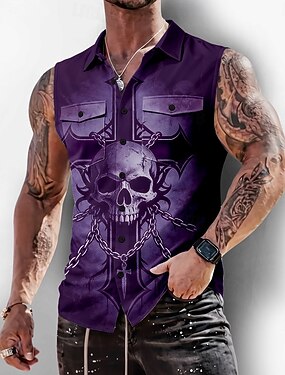 Hombre Cráneos Calavera Camisa Abotonar la camisa Camisa sin mangas Sin Mangas Estilo gótico oscuro Exterior Casual Verano Primavera Cuello Vuelto Impresión 3D Dos bolsillos delanteros Negro Morado