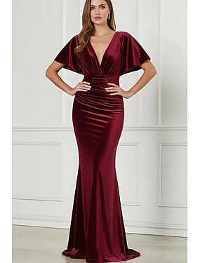 Corte Trompeta Sirena Hasta el Suelo Trajes de gala Vestidos de noche Corte Cenicienta Vestimenta formal Elegante Manga Corta Escote en Pico Boda Formal Terciopelo con Plisado